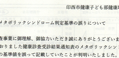 ところが、先日印西市から封筒が届いた。薄いので何の連絡だろうと思って開けてみると「メタボリックシンドローム判定基準の誤りについて」。空腹時血糖は110未満であればメタボに該当しないのだが、印西市では100未満で判定しており、その結果メタボでないのにメタボと取り扱っていたのである。つまり私は、特定保健指導の対象でなく、受けなくてもよかったらしい。