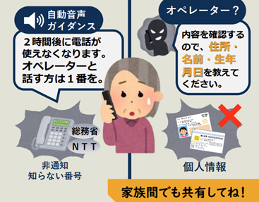「こちらはNTT、日本電信電話株式会社です。この電話は2時間後に使えなくなります。オペレーターと話したい方は1を…」
