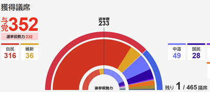 総選挙が終わった。2週間前の記事で予想した通り自民党が圧勝。単独過半数どころか300を超える地滑り的勝利で、維新と合わせた議席は全体の3分の2どころか4分の3を占めた。中道は100議席減で改選前の3分の1、小沢、岡田、枝野の元代表、現幹事長の阿住が落選した。