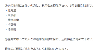 すると、開園することはしているのだが、なんと注釈付きである。それも、コロナ予防に配慮しマスク着用は想定の範囲内だけれど、「次の地域にお住まいの方は利用をお控えください」の中に、なんと、わが千葉県が入っているのである。