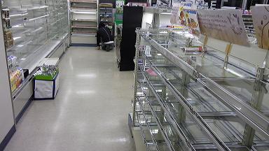 びっくりしたのは、朝食を調達しようと寄ったコンビニに、パンやおにぎり類が全くなかったこと(前回の写真)。吉野家も他の牛丼屋、そば屋も、「品切れにつき閉店とさせていただきます」の張り紙が張られている。とりあえず、コンビニに残っていた水関係を多めに調達する。