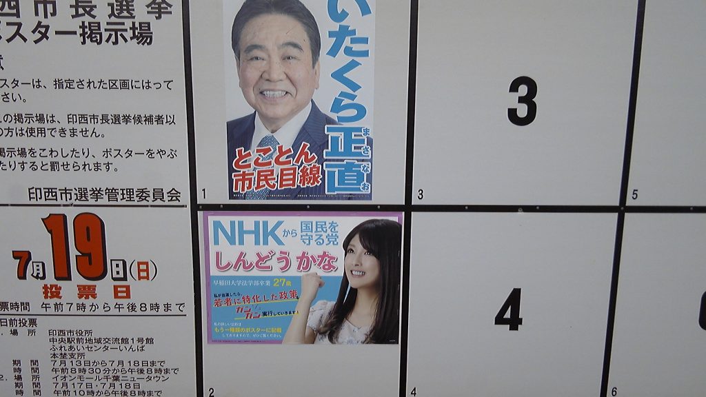 N国党がわが印西市長選に立候補してきた。国会に1議席与えてもらったにもかかわらず「NHKから国民を守るために」何もしない党が、印西市長になって何をするというのだろうか。ろくなもんじゃねぇ。