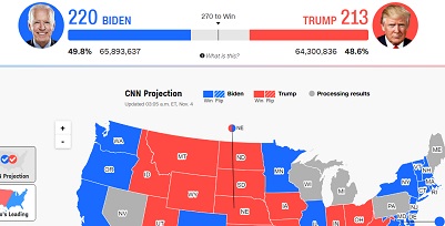 翌5日朝起きてみると、また様相が一変していた。トランプ氏が勝ったと主張していたウィスコンシン州とミシガン州が逆転、主要メディアが両州でバイデン当確を打っていた。ペンシルバニアとジョージアも6日に逆転した。