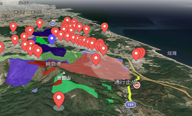 当時の記録を読むと、予想以上の登り坂で国道を行けばよかったみたいなことを書いてある。そして、この県道がまさに、延焼のおそれがあるので通行止になっている県道159号(下図)であり、登り坂のあった上に山火事が広がっているのである。
