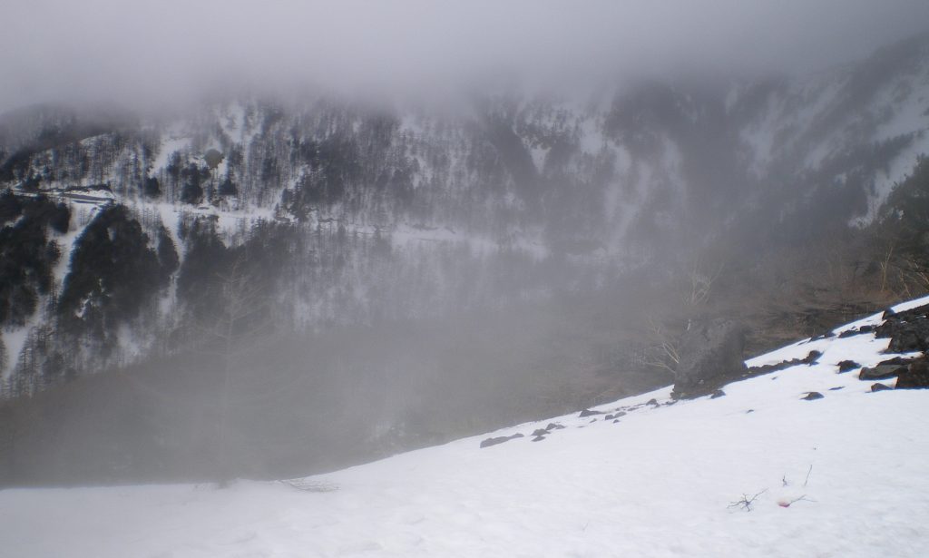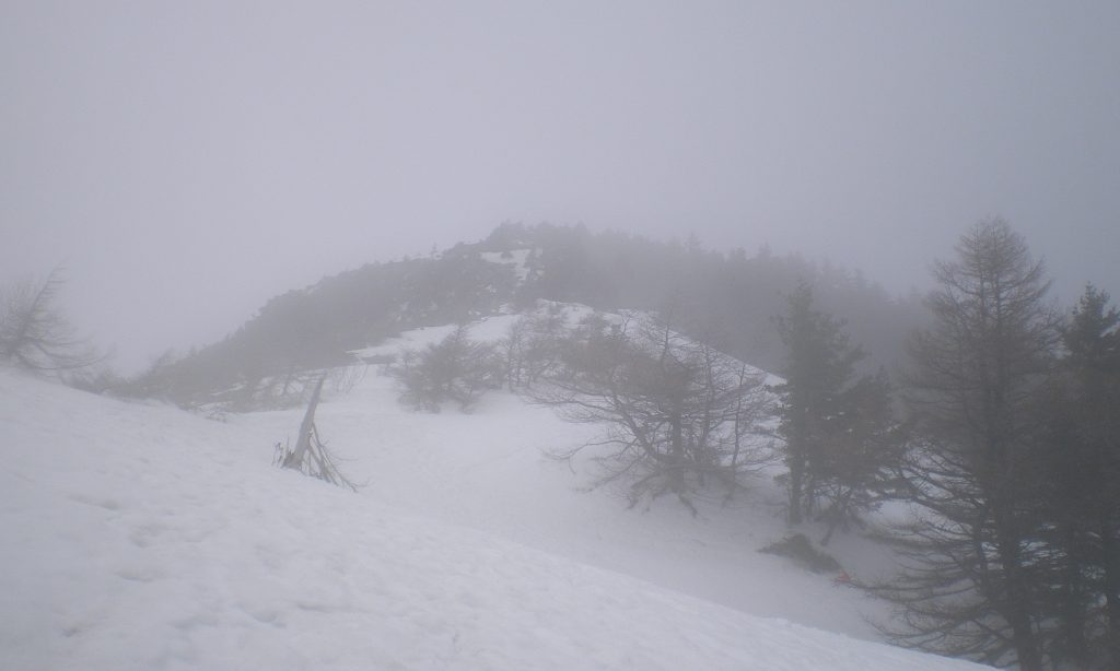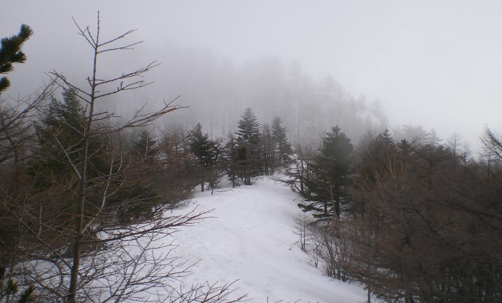 かなりハードな運動なので、汗が噴き出てくる。時々、ストックを地面に突き立て、手袋を脱いで汗をふく。午後から晴れるという予報だったのでゴーグルも持ってきたのだが、依然として霧の中である。あるいは下から見ると、雲の中だったのかもしれない。