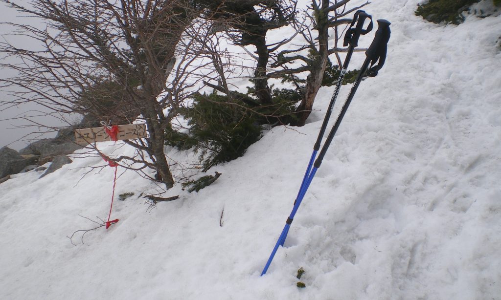 背中のリュックから高峰温泉でもらったコース案内図を取り出す。水ノ塔山の頂上付近にはスノーシューコースは続いておらず、頂上直下を巻いて篭ノ登山方面に向かっているようだ。ということは、ここが終点ということである。最高到達点にストックを立てて記念撮影し、ここで引き返すことにする。ゆっくり休む場所がないのが残念だ。