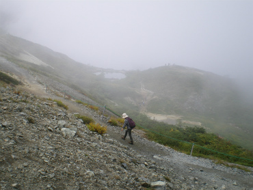 二台目、三台目のリフトを登る頃になるとだんだんガスが出てきて、見通しがきかなくなった。晴れていればかなり遠くまで見晴らせるはずなのだが、すぐ近くの山も霧にかすんでいる。リフトの終点となる八方池山荘からは、登山道(岩道)コースと木道コースに分かれる。奥さんの希望により木道コースを登ることにする。