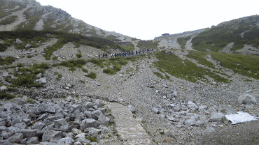 一ノ越山荘が斜め上に近づいてくると、登り坂の勾配も険しくなる。道は狭くなり、しかも崩れた箇所が工事中で作業している人や資材があるので、すれ違いが困難である。そこに、立山まで登ってきたと思われる中学校の団体が連続して下りてきた。1クラス40名ほどをやり過ごすのも結構時間がかかる。それが6クラスほどあったので、かなり待ち時間があった。