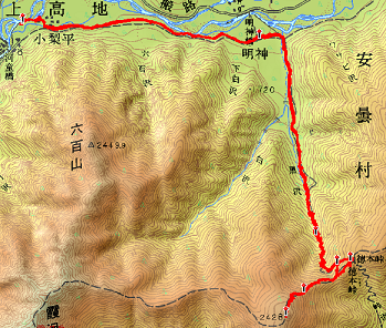さて、この日は標高差約900mのジャンクションピークが目標である。900mなら3時間というのが私の目安であるが、明神までの林道歩きも長いし、実際に歩かないとどのくらいかかるか分からないというのが正直なところである。「プロ・アドベンチャーレーサー」陽希くんは、上高地から霞沢岳まで登ってさらに蝶ヶ岳まで1日で歩いたが、私にはその半分でもきつい。