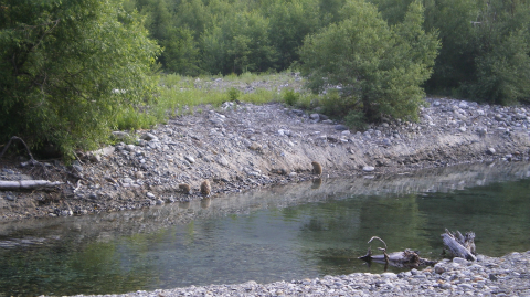 ためしに水に触ってみると、冷たいことは冷たいがびっくりするほどではない。信濃川水源標の水がびっくりするほど冷たかったのを覚えているが、十数mでも地表を流れていると温まってしまうようである。ちょうど、水路を迂回させて田圃に入れる水を温かくしているのと同じ理屈であろう。