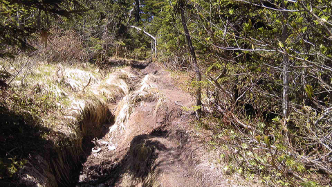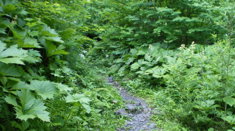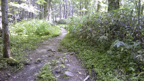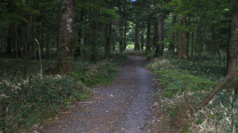 分岐を過ぎても当分の間は、砂利の敷かれた広い道が続く。タイヤの幅で轍(わだち)が2本続き、轍の間は草が生えている。常識的に考えると車が通った跡なのだが、この奥に何かあるのだろうか。30分ほど歩くと道は細くなり、本当の登山道となる。沢を渡る細い橋があったから、ここから先にはさすがに車は入れないはずである。