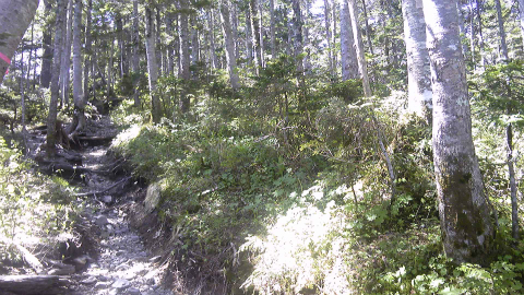 テント泊だから、日が暮れると眠り夜明けとともに起きる。午前4時に起きて朝の支度をし、デイパックを持って5時50分にスタート。着替えとかEPIガスはテントに置き、デイパックの中は雨具・ヘッデン等の緊急用品と行動食・非常食、水2リットルと地図類だけなので5kgにならないくらい。荷物が重くてへたばることはないが、2000mを超える山は久しぶりである。