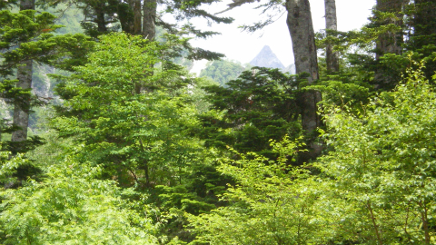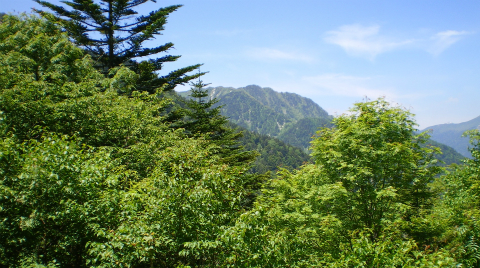 明神では、明神岳は上から迫ってくるような感じなのだけれど、徳本峠方向に遠ざかってかつ標高が上がったので、目の高さにピークがあるように感じる。さらに標高が上がって遮るもののない霞沢岳はさぞかしいい景色だろうと思った。今回はジャンクションピークまでだったけれど、この景色はこの後も樹間から目を楽しませてくれた。