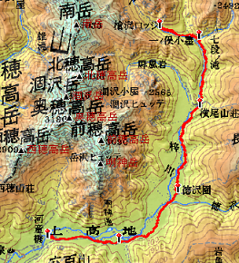 とはいえ、霞沢岳はいつか行ってみたい山であるので、その予行演習の意味もあって、ジャンクションピークを選んでみたのである。徳本峠・ジャンクションピーク間の約4倍が霞沢岳までの所要時間になるので、あまりに時間がかかるようならそもそも行くのは無理ということになる。