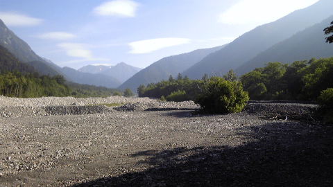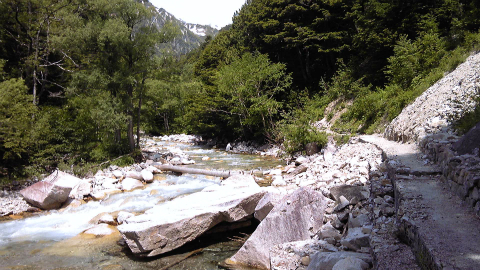 ガイドブックによると水場のある第1ベンチが休憩適地と書いてあるが、その前に沢と合流するあたりで、おあつらえ向きに登山道から河原に下りる道がある。たいして距離もないので、河原に下りてみた。水は岩の下にもぐってしまったのか、流れは見えないし音も聞こえない。ガレ場の適当な場所に腰を下ろすと、なんと明神岳・穂高岳が目の前にあった。