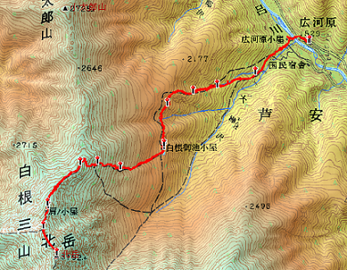 沢コースの分岐で時間を見ると15時55分。何とか間に合いそうだ。しかし、ここから先の緩やかな下りでも、足がなかなか前に進まない。後続グループに、どんどん追い抜かれる。広河原山荘でビールなんてとんでもない話で、何とか体をひきずってバスターミナルに急ぐ。広河原バスターミナル着は16時15分。白根御池小屋から3時間20分かかった。