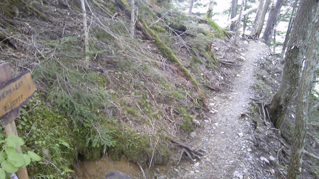 白根御池小屋からのトラバース道は長いのが分かっていたので、「あと20分表示」まで30分以上かかったけれど特にどうとも思わなかった。小屋までは軽いサブザック、小屋でデポしたリュックに詰め替えて10kgと重くなったので、まあ多少は時間がかかっても仕方がないと思っていた。