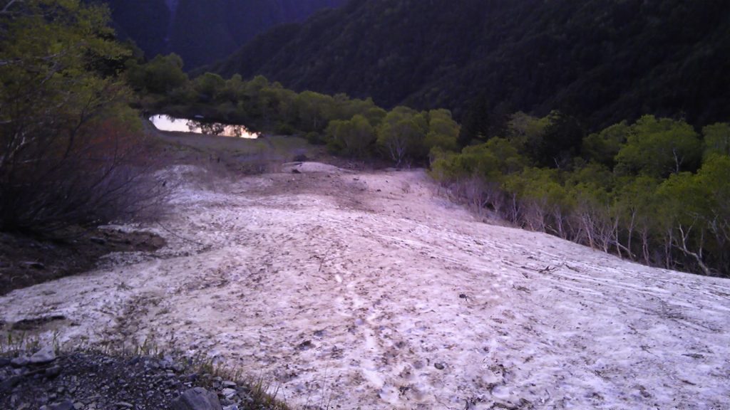 手持ちの水がなければここで汲んでいかなければならないが、まだ水は十分ある。この日はこのまま手持ちの水でやり繰りすることにした。(翌日に横尾の奥のワサビ沢で湧いていた水の方がずっと冷たかった。こちらは、特にガイドブックでは水場とは書いてなかったけれど)