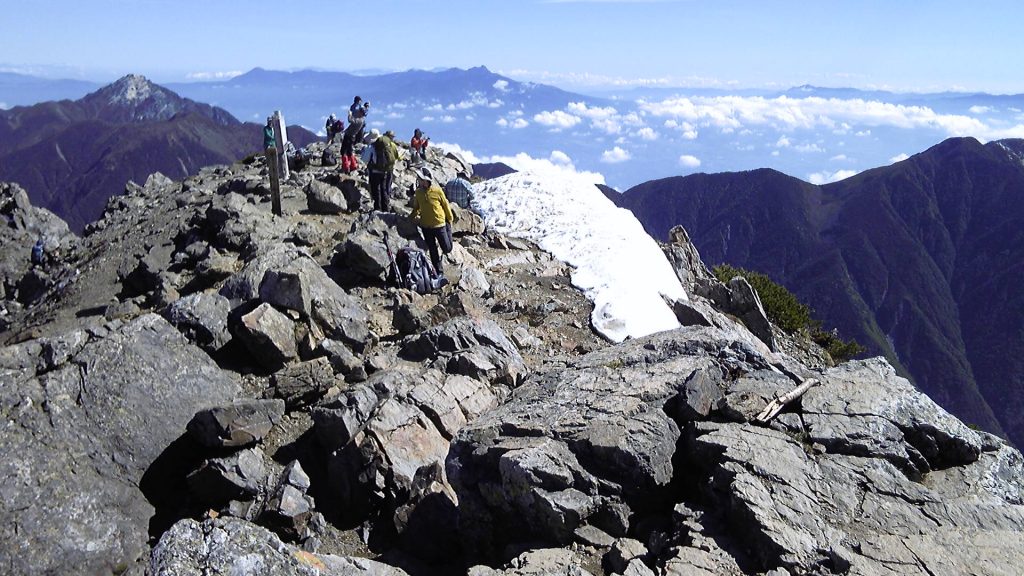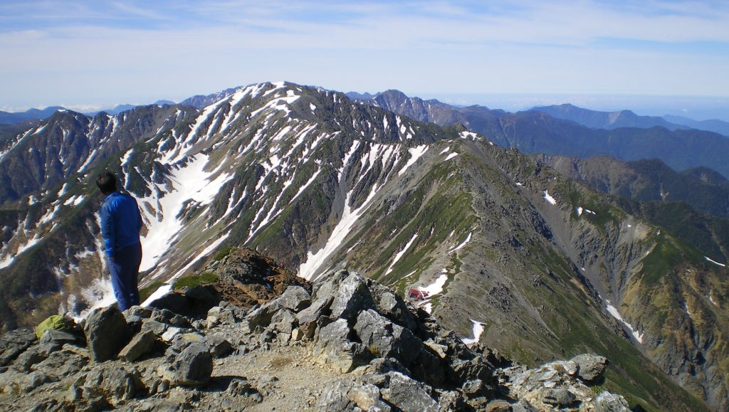 北岳最高点から三角点方向。東斜面に残雪が見える。左後方に甲斐駒ケ岳、その後ろに八ヶ岳。