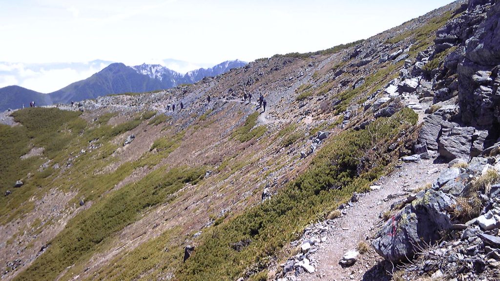 帰りの肩の小屋から小太郎尾根分岐までの道。この日ほとんど唯一、私好みのゆるやかな稜線でした。朝方は逆光で写せなかった鳳凰三山がちらっと見える。