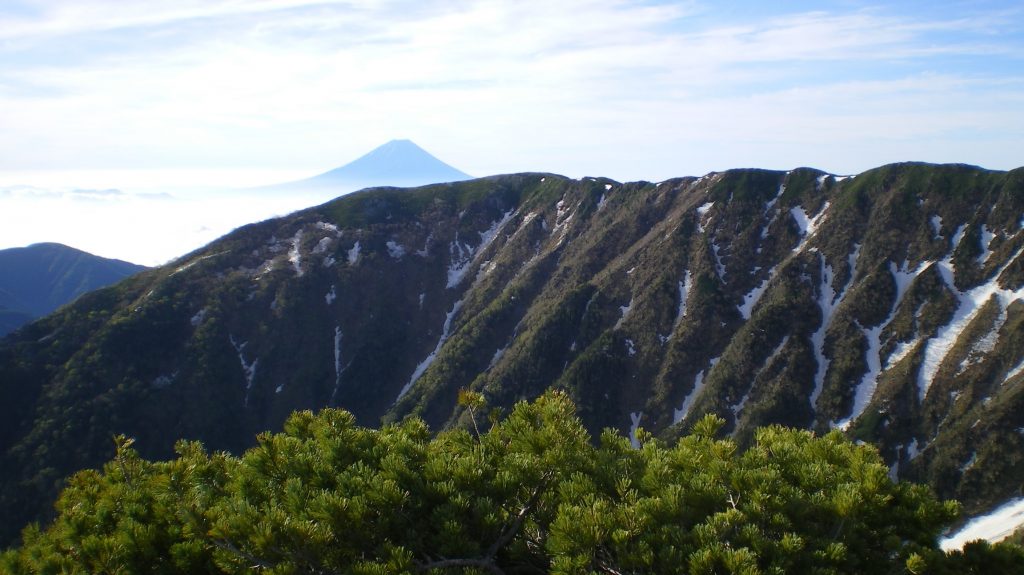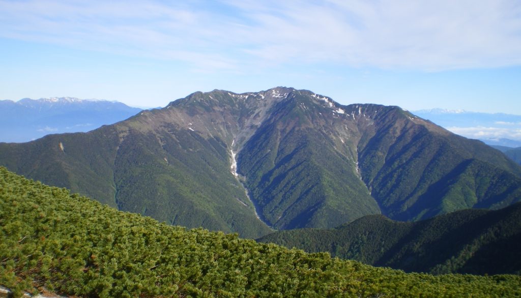 この日は好天で、登山道から仙丈ヶ岳が雄大な姿を見せた。後方には中央アルプスの峰々、右奥には遥かに雪をかぶった北アルプスを望む。