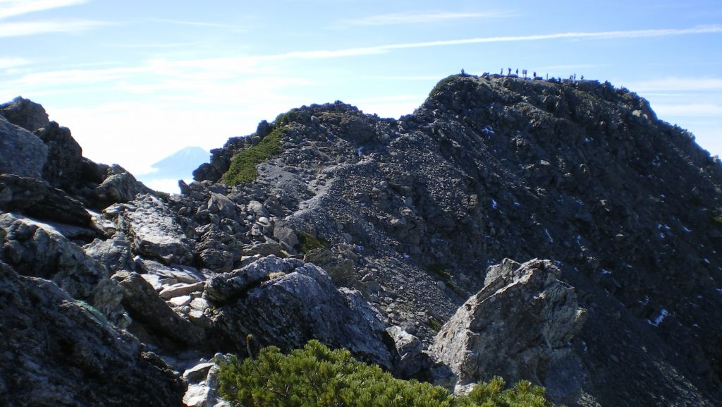 一息ついて、下りに向かう。小太郎尾根分岐までの道は、気持ちいい稜線歩きだ。今度は正面に甲斐駒ヶ岳、その後ろに八ヶ岳、左に仙丈ヶ岳、右に鳳凰三山である。朝方は逆光で見にくかった鳳凰三山がよく見える。地蔵岳のオベリスクが天に向かってそびえていた。