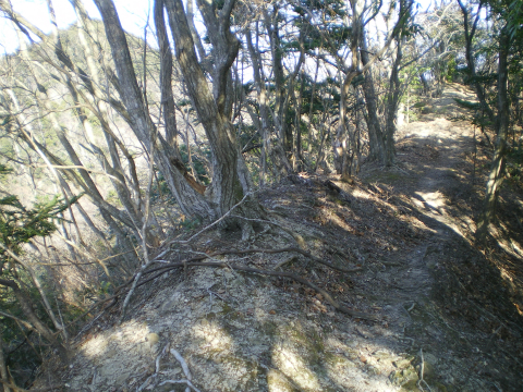とうとう尾根道は、左が崖というとんでもない場所にさしかかる。見た目20mくらいは垂直に切り立っている。足を滑らせたら、ケガで済むかどうか微妙なところである。そして、足もとの木の根の間から中空が見える。どうやらオーバーハングしているようだ。