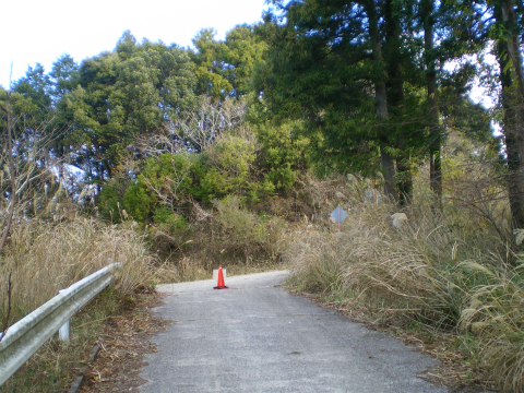 さて、次の目標となるのは「房総のやまあるき」で言うところの彫刻家の家である。彫刻家の家から、「舗装路は右におりるが、それを行き、左手一軒家先を左に入り石段を下りるとトンネルに出、前方に古道入口がある」というのだが(w)、そもそも道路はあるけれど人家は見えない。方向は合っているから大丈夫だろうと歩いていたら、道から引っ込んだところに倉庫のような建物があった。