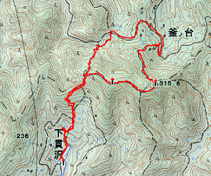 家に帰ってからGPSデータをカシミールに落としてみたところ、撤退地点までは市町村界を忠実にたどっていて、行き着いた場所は1/25000図上では林道が通っているはずのところなのである。ちなみに木之根峠はその先の鞍部で、市町村界をそのまま進み標高差で40mほど下っているように見える。