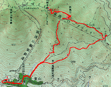 今回目指すのは、筑波山の中でもマイナーコースといっていい薬王院コースである。ロープウェー、ケーブルカーの筑波山ハイキングマップには載っていないが、地元の案内板には、旧ユースホステルまでの登山道とともにちゃんと描かれている。
