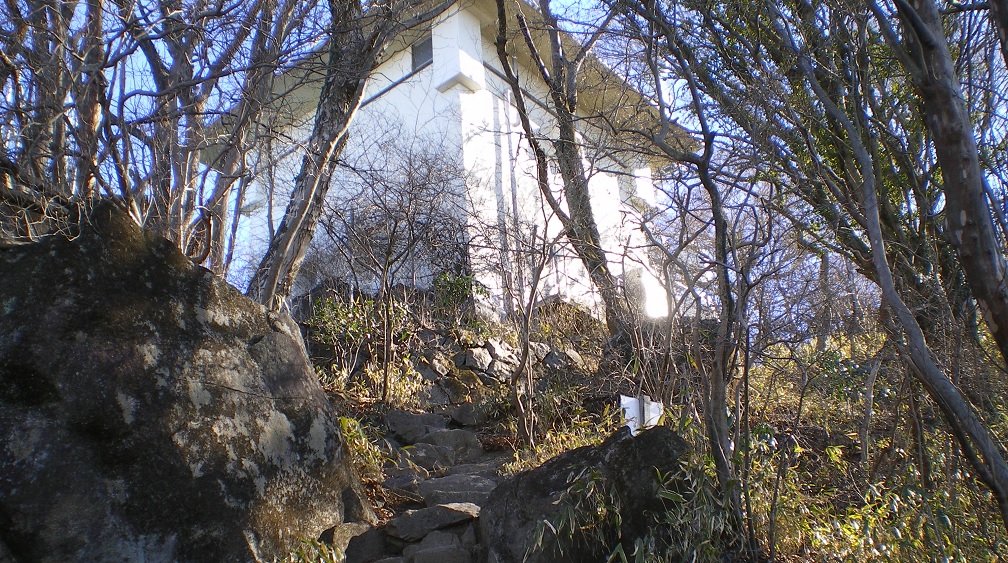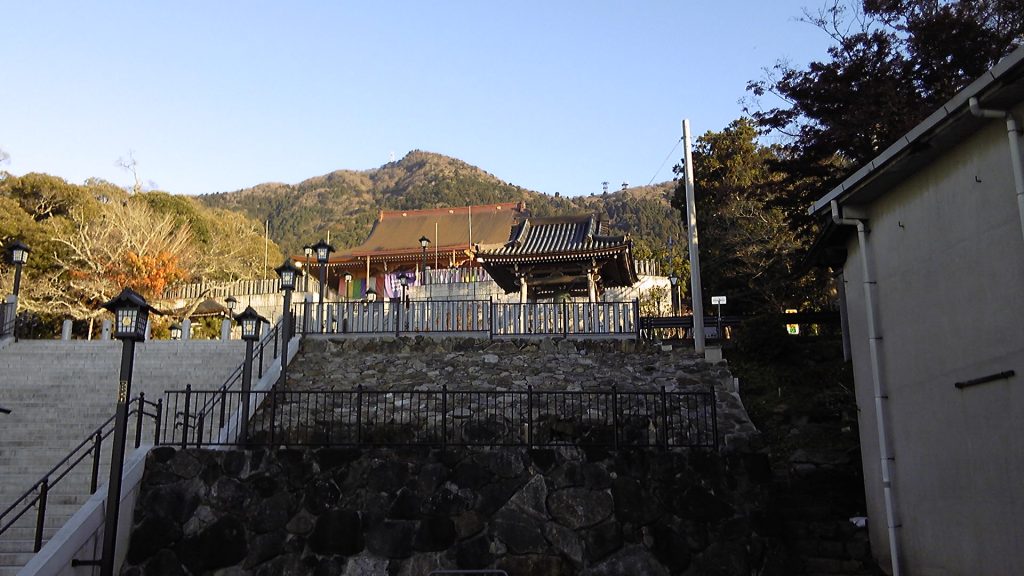 しばらく民家が続くものの、のっけからかなりの急坂である。「椎尾急傾斜危険区域」と書かれた立て札が立っている。息を切らせながら登るとガードレールが見えて来て、駐車場から登ってきた太い車道と合流する。左手が薬王院である。