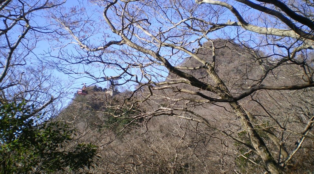 頂上直下の肩まで来ると、すぐ上にロープウェイが動いているのが見える。そして頂上までは、手足をフル稼働しなければ登れない岩場の急登である。標高が低いからといって、バカにできない。