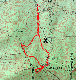 なんということだ。登りの奈良駄峠の登山道と同様、「×」印の方向に進めばよかったのだ。だったら、コースに登山者が入れないよう立入禁止の看板を立てるなりテープを張っておけばいいのに、それをしないから迷い込んでしまう。