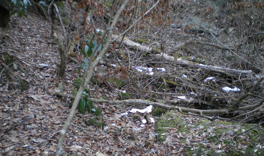 一度は、踏み跡を追って斜面を登って行ったら道間違いだった。前日が雨だったので靴を濡らさなければ渡れない沢の向こうに道が続いていて、「→国民宿舎」の看板もほとんど崩れて何かあったことしか分からない。