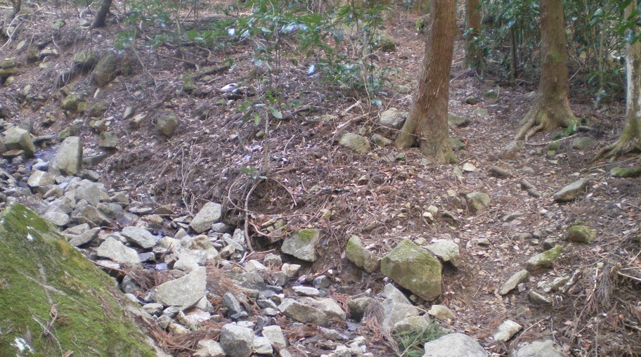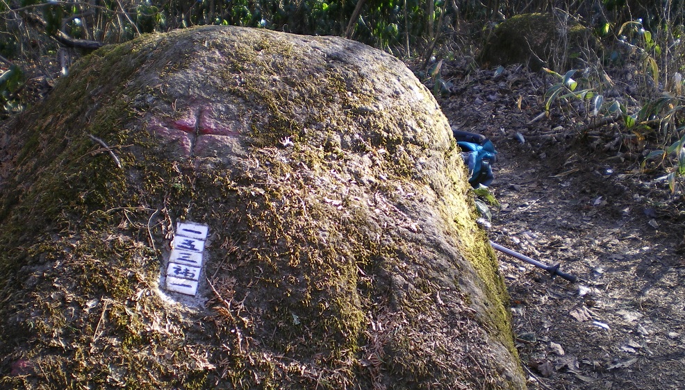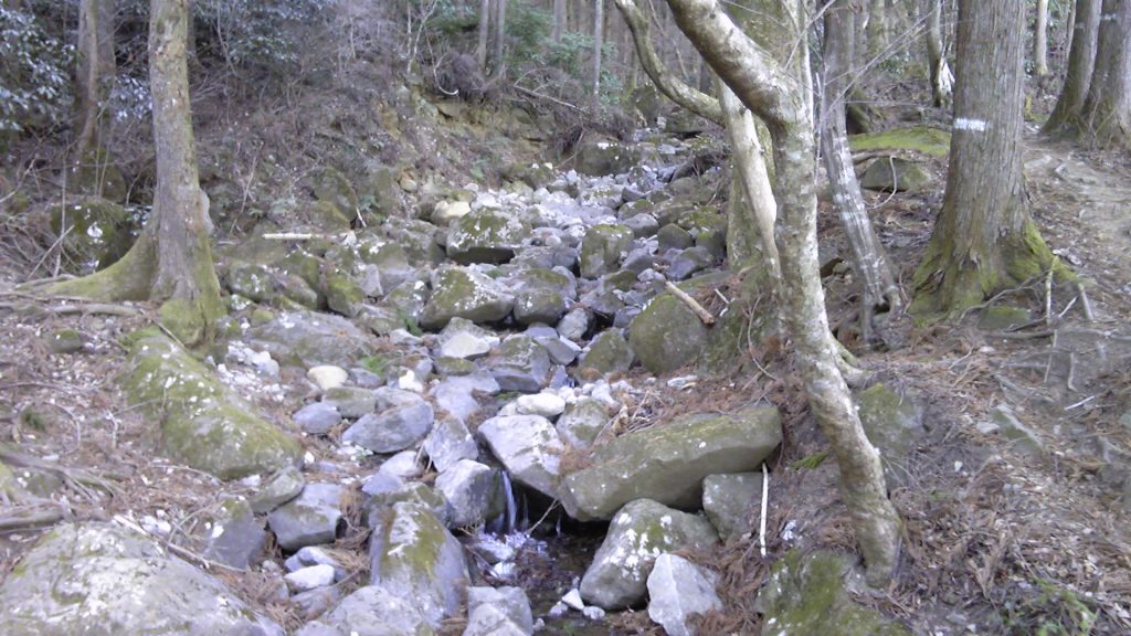 薬王院を過ぎて登山道に入ると、ひたすら登るだけである。地図上で目標になるのは林道と合流する標高400mを過ぎた地点だが、なかなかそこまで着かない。登り始めて1時間、登山道に座れそうな石を見つけたので腰掛けて水分補給する。
