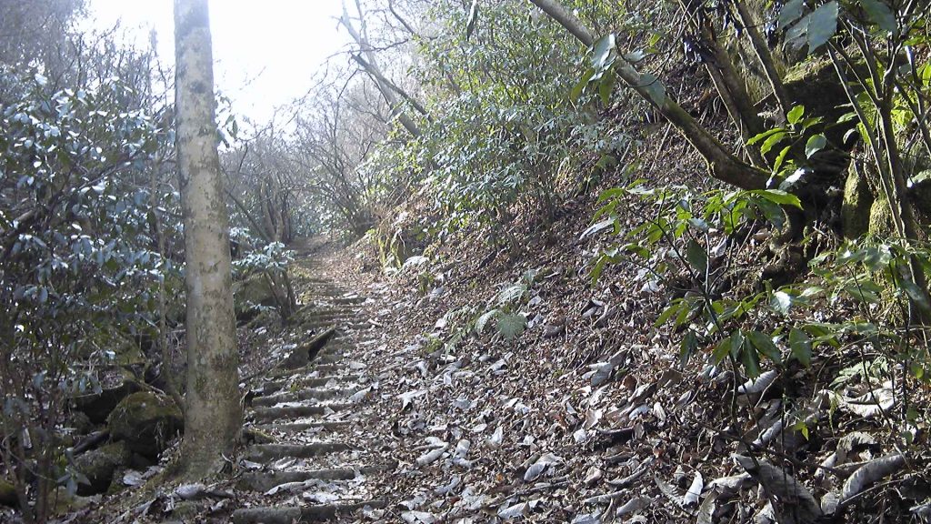 石段はそれほど長くは続かず、林間に続く登山道となる。この日はほとんど日が差さず暗いが、傾斜はびっくりするほどではない。白雲橋コースよりも緩やかだろう。
