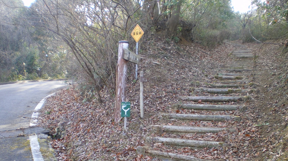 県道に出て舗装道路を登り下りしたが、この先は結構長い距離を迂回するようである。1/25000図によるとショートカットする登山道があり、300mもしないうちにいま歩いている舗装道路と再合流するはずである。登山道入り口は、すぐ目の前にあった。