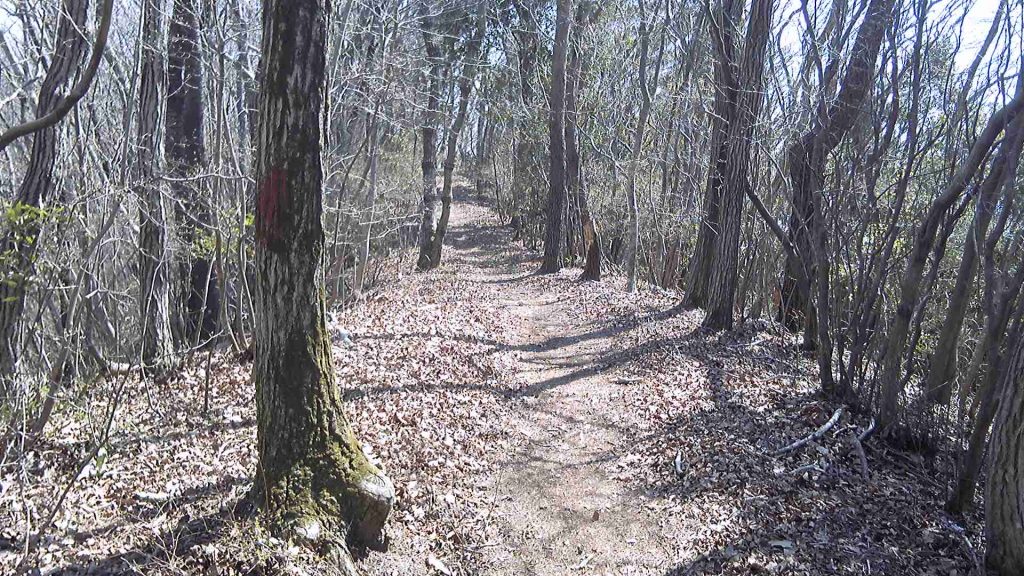 約1時間でつつじヶ丘着。水分補給して小休止。ここから先は初めてのルートとなる。東筑波ハイキングコースと立派な名前が付いているので案内があるかと思ったのだが、どこにもない。地図を頼りに探すと、トイレの奥に登山道入口があった。