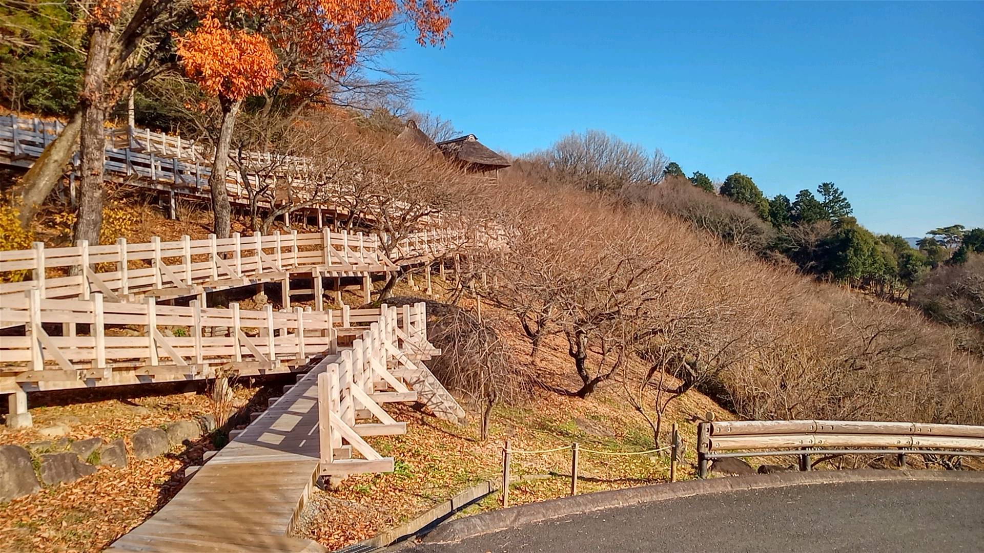 ようやく梅園が見えたのは、みかん園から1時間も歩いた頃であった。なるほど一面の梅の木が広がるが、残念ながらつぼみさえふくらんでおらず枝だけである。展望台や東屋もあるので、きっと季節には大勢の人でにぎわうのだろう。