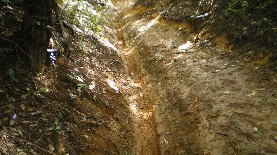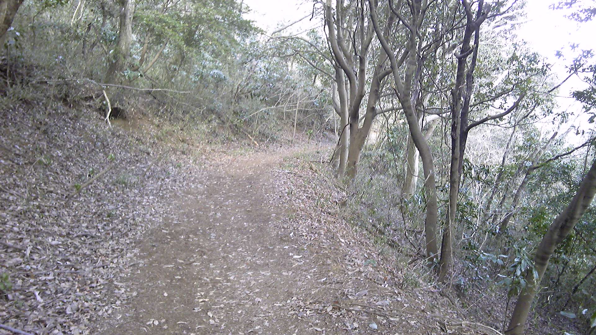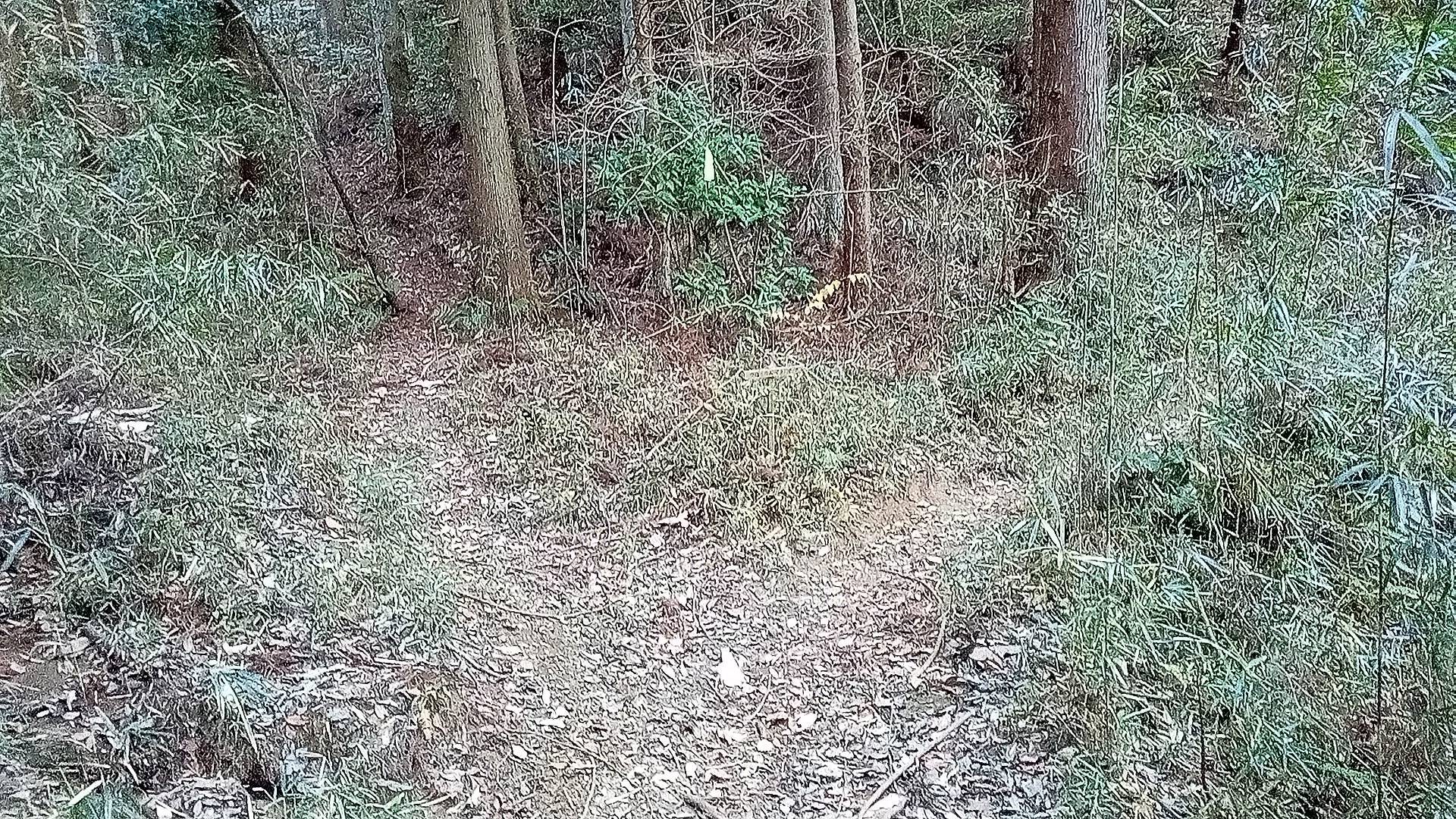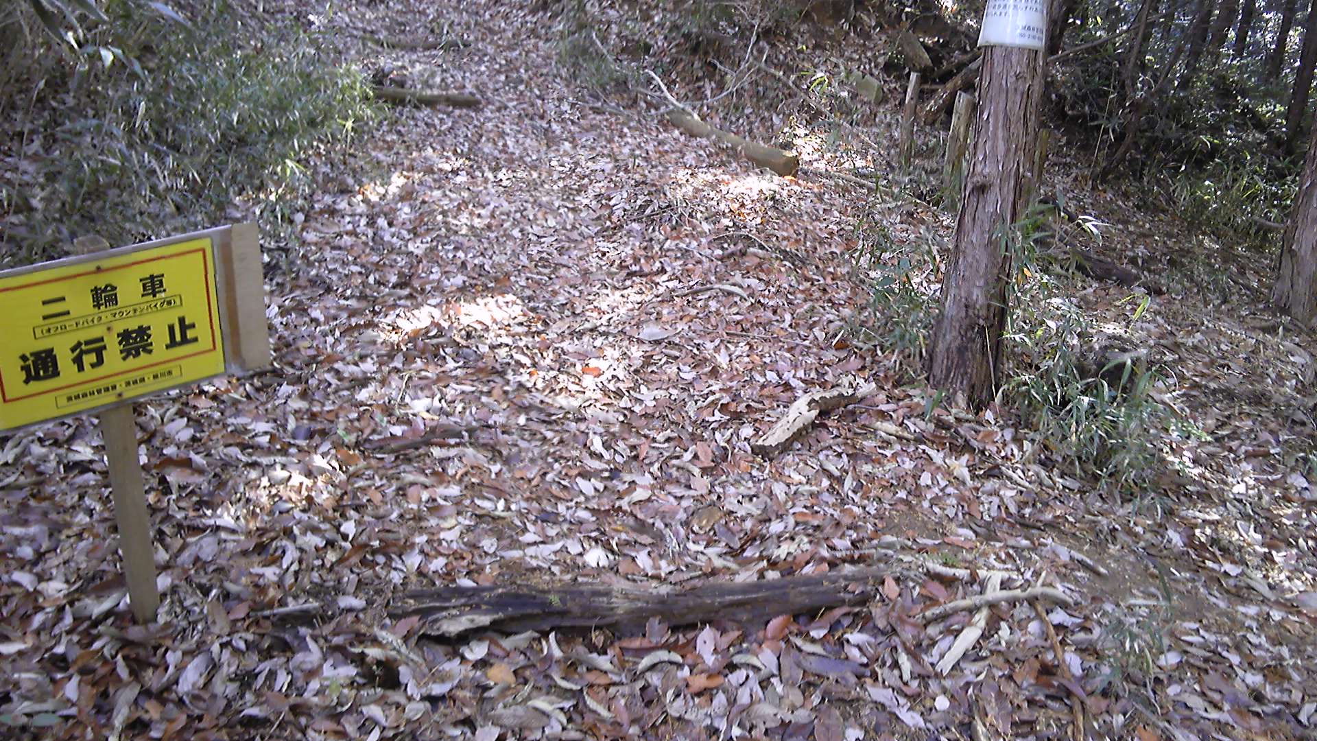 マウンテンバイクが来れるなら下まで通じてそうだが、ネットにあるような気持ちいい道ではない。そして、歩くうちにいくつかに道が分かれて、深く掘れた跡は見えなくなった。どこか林道に通じるルートがあるのだろうか。