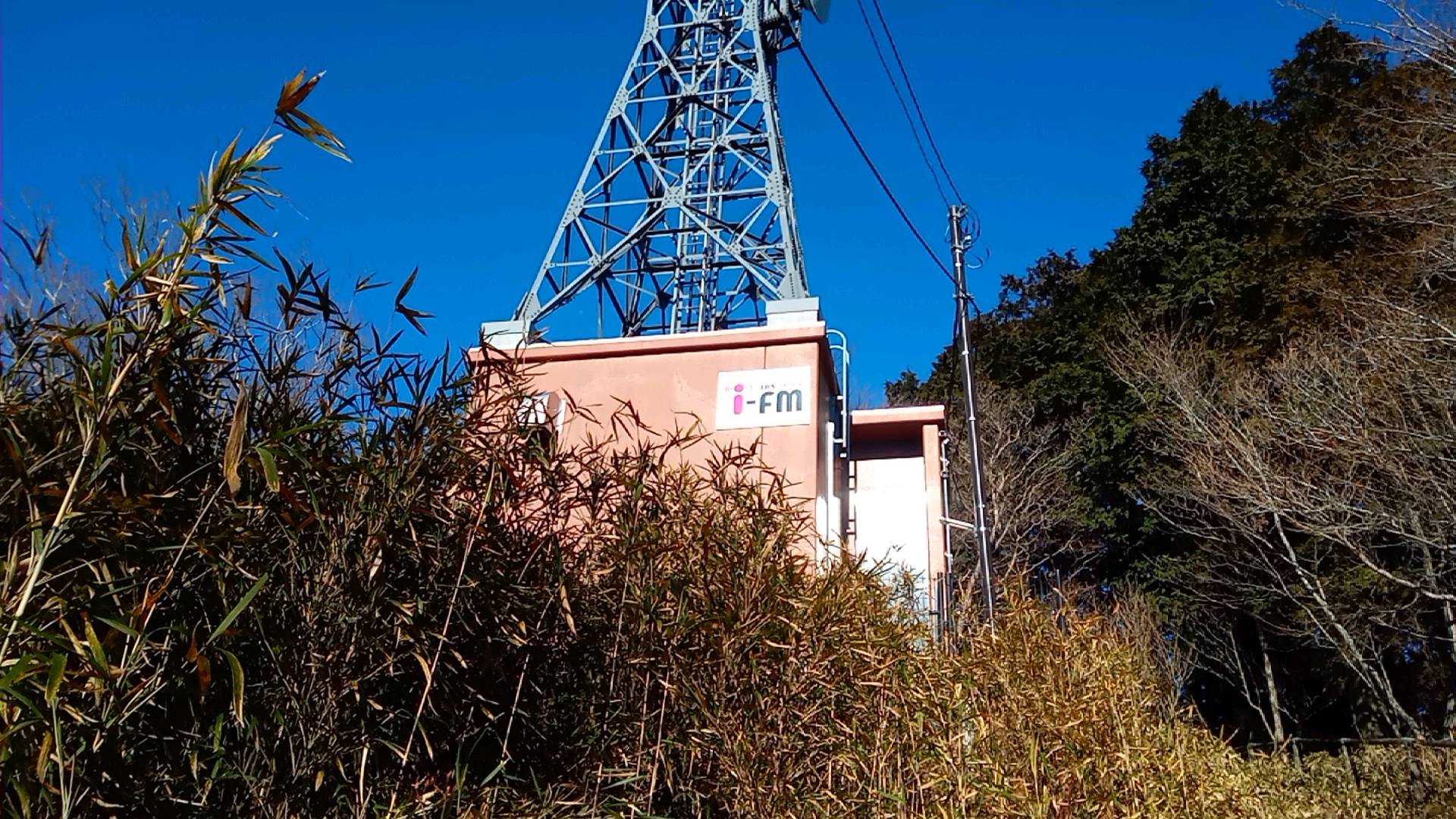 急坂コースと合流すると間もなく、朝日峠からもよく見えたアンテナ塔の前に出る。ここで少し道は狭くなるが、この先にもう一基ある大きなアンテナ塔までは車道の尾根道が続いている。