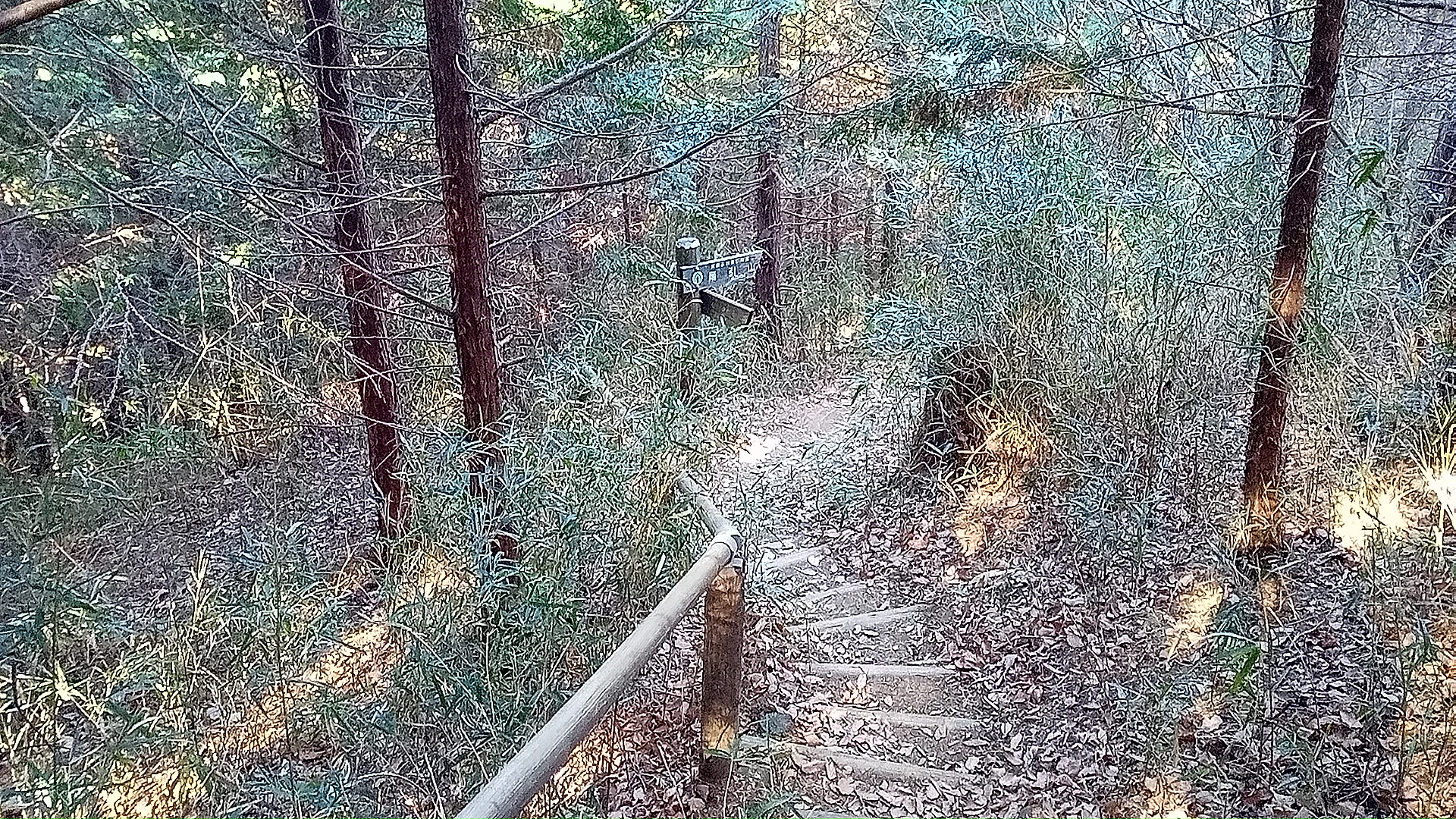 宝篋山への尾根道はゆるやかなアップダウンで心地よい。1つか2つピークを越えると5分か10分でA-4分岐に着いた。ここから小町山方面に向かって下りて行く。