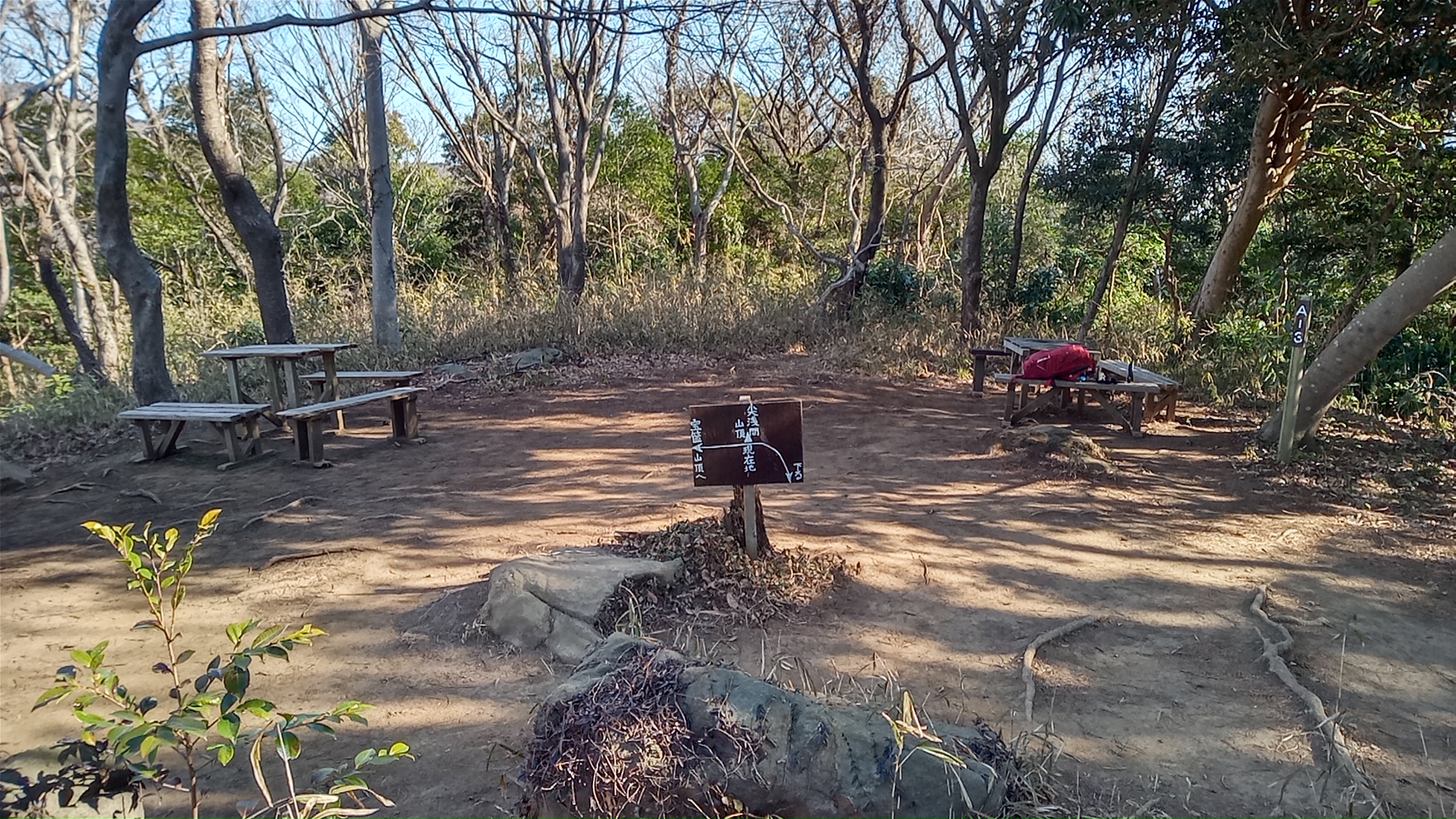 登山口から1時間ほどで小町山頂上。頂上にはテーブル付ベンチが4、5セット置かれている。