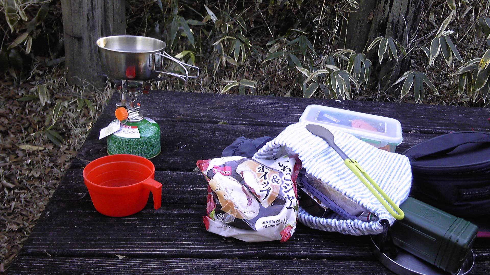 小町山が騒がしかったので、ここでお昼にする。テルモスのお湯でコーヒーを淹れて、前日に用意した20%引きのパンを2つ。ホイップクリームいちごジャムと、コーヒーロールである。
