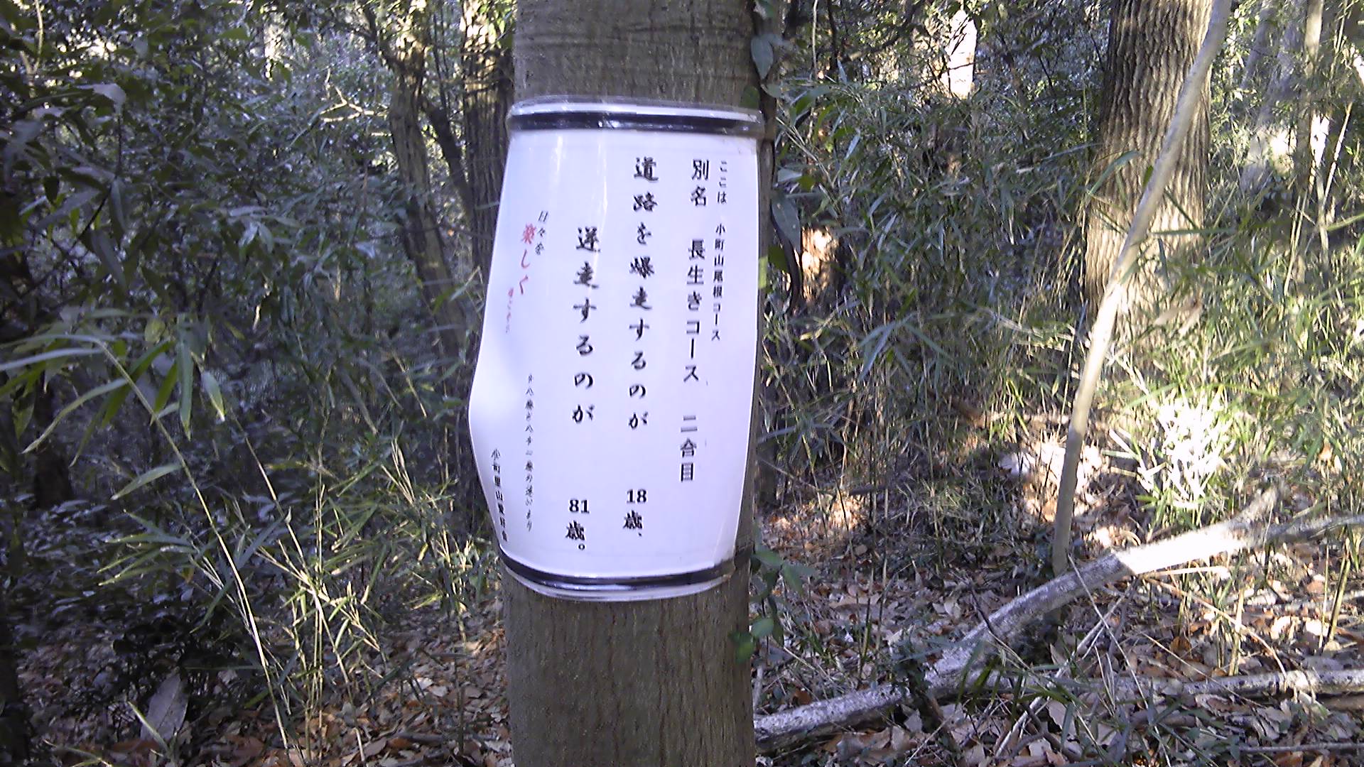 小町山への登山道はきちんと整備され、合目には丁石の代わりにお手製の標語が貼られている。2合目には「爆走するのが18歳、逆走するのが81歳」。他にも「何も知らないのが18歳、何も覚えていないのが81歳」とか。