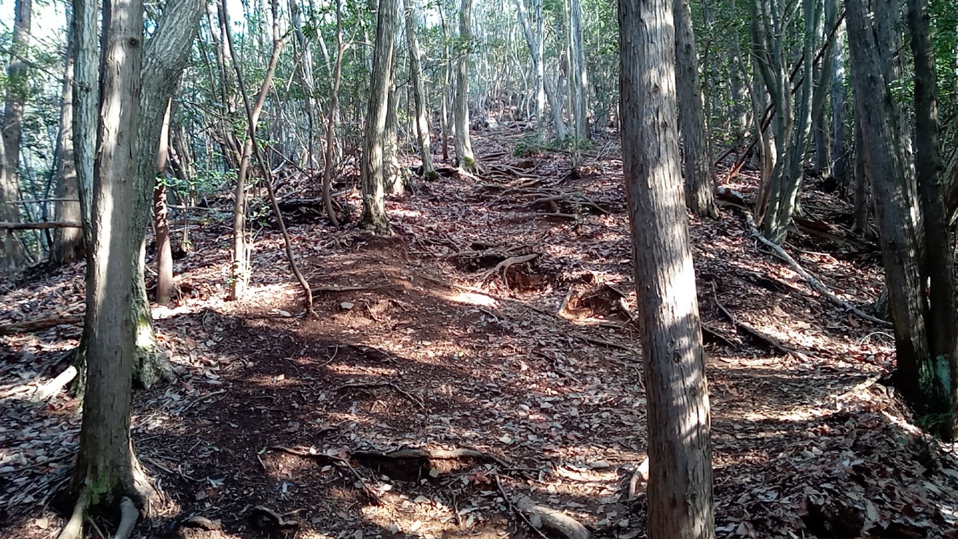 林道に合流してそのまま進むと下山してしまうので(ここで間違えて5分ほど下ってしまった)、林道から分岐した急登を登る。最初は心細い道だがすぐにちゃんとした登山道になり、ここを進むと三角点に達する。