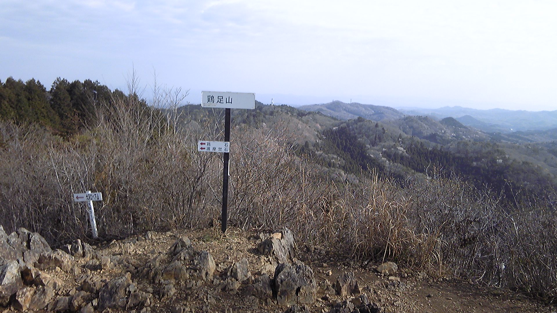 小さなお社があって、「鶏足山」とワープロ打ちの山名標が立てられている。ネットでよく見る弘法大師伝説の案内板は、山頂から少し下がった林の中にある。案内板も、一緒に置いてある山頂の新年神事の案内も、半ば朽ちてしまっている。