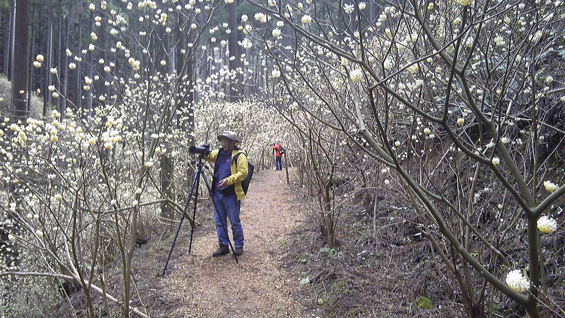プレハブの横から遊歩道が始まり、園内は一方通行である。登り坂を登って、右に曲がるとすぐに満開のミツマタが目の前に広がる。谷全体にミツマタが植えられていて、それが全部咲いているのであった。
