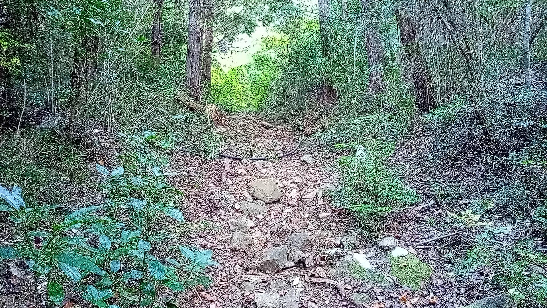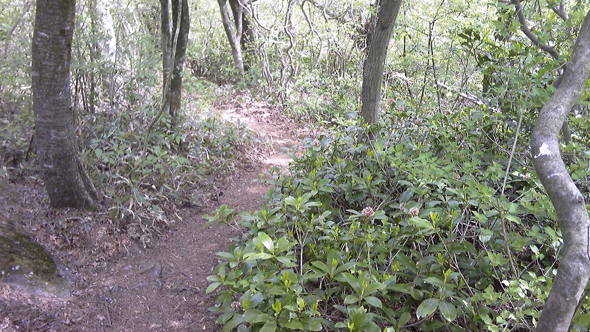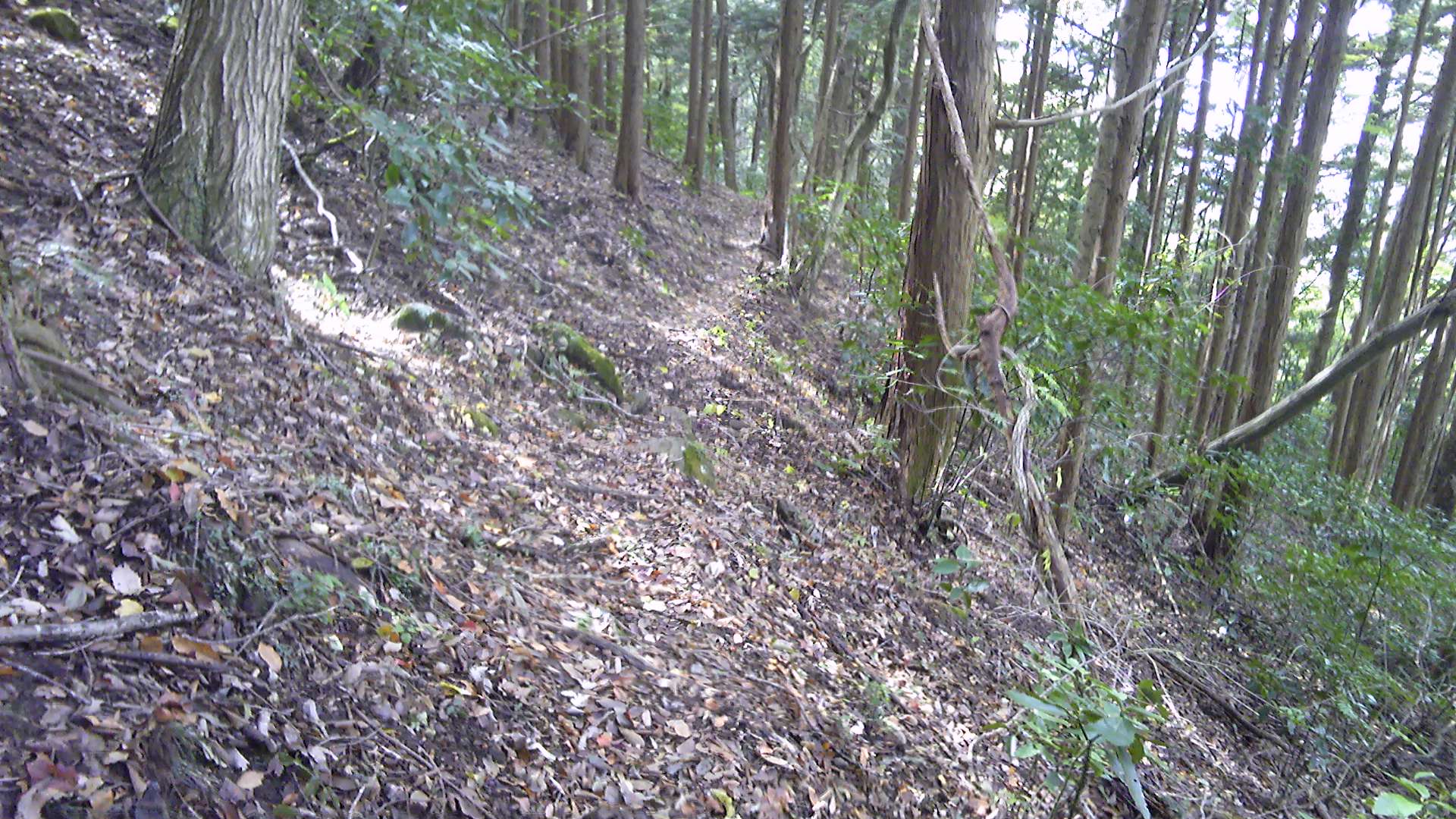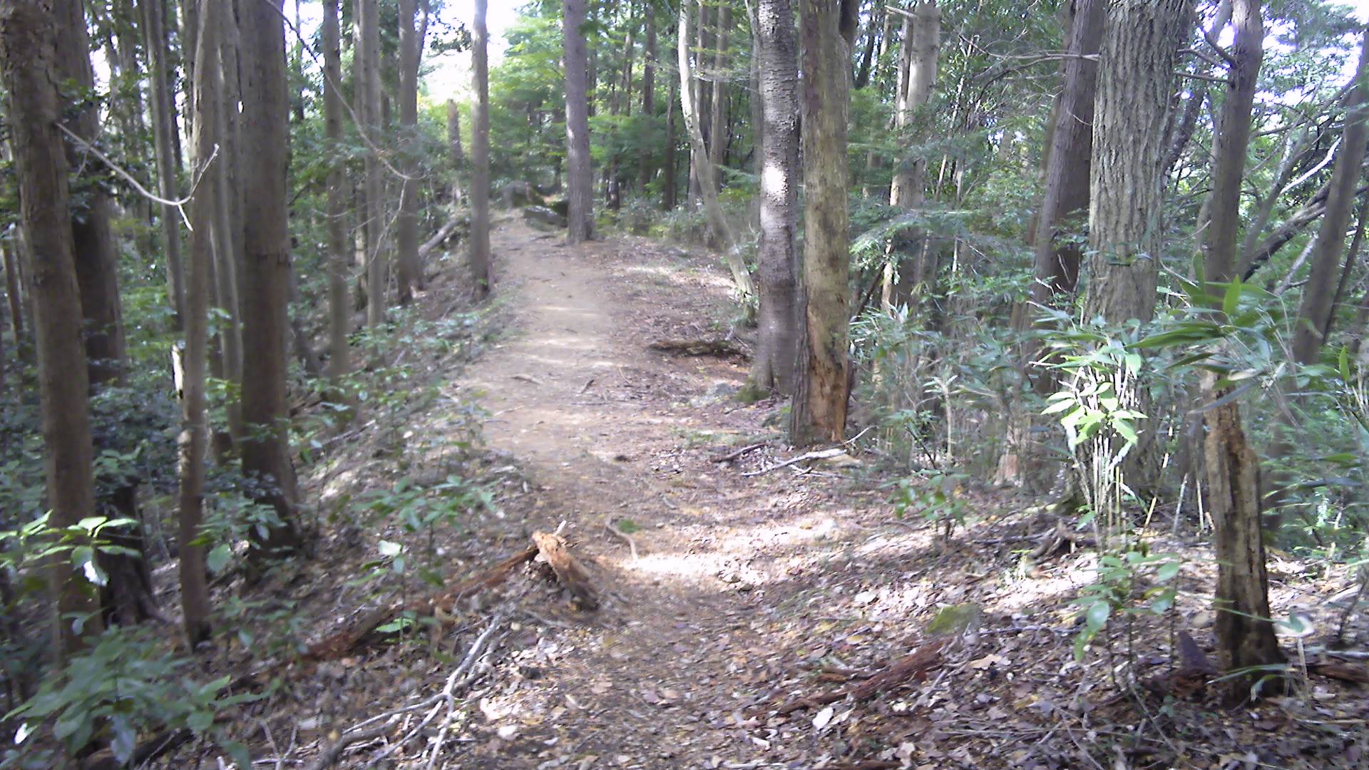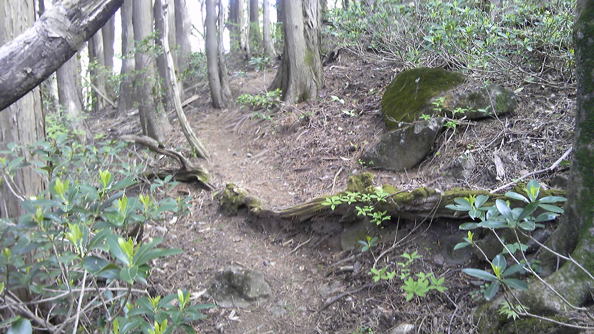 五輪塔から30分も下りた頃だろうか、行く手に太い道が現われた。これまでは踏み跡だが、今度ははっきりした登山道である。尾根から遠ざかる道だが、起伏もなく道幅も広い。ここを進めば登ってきた道に合流すると思われた。