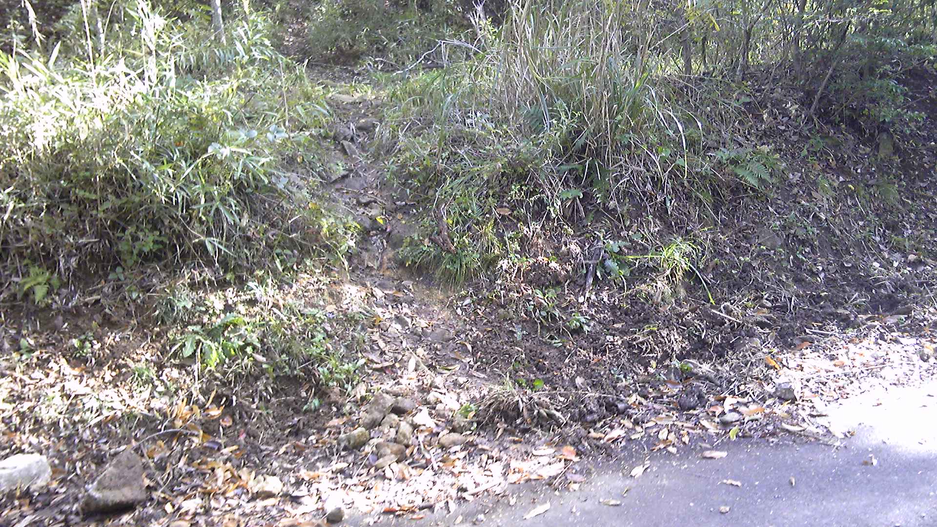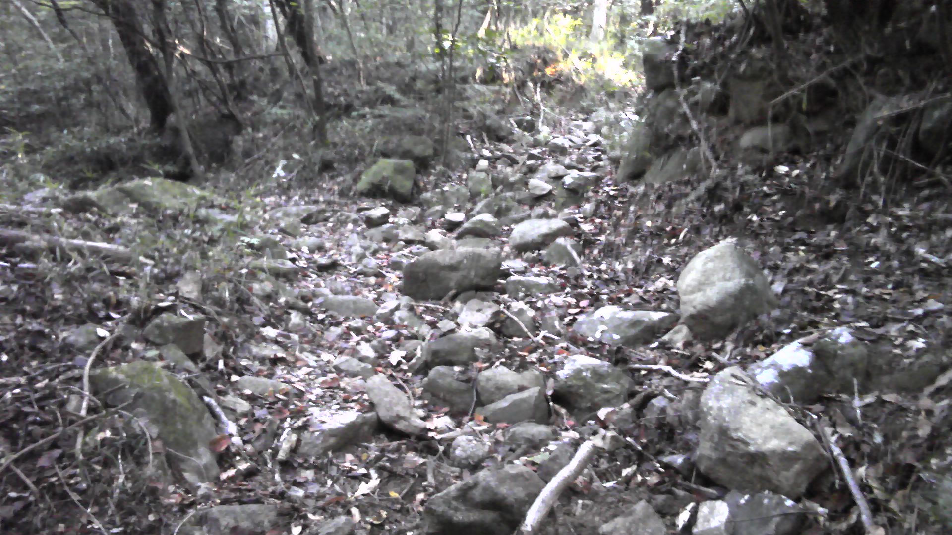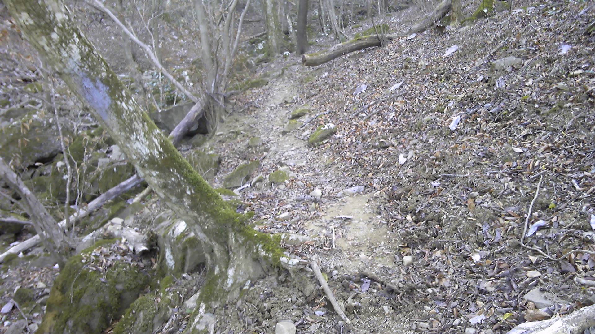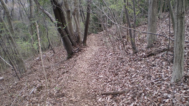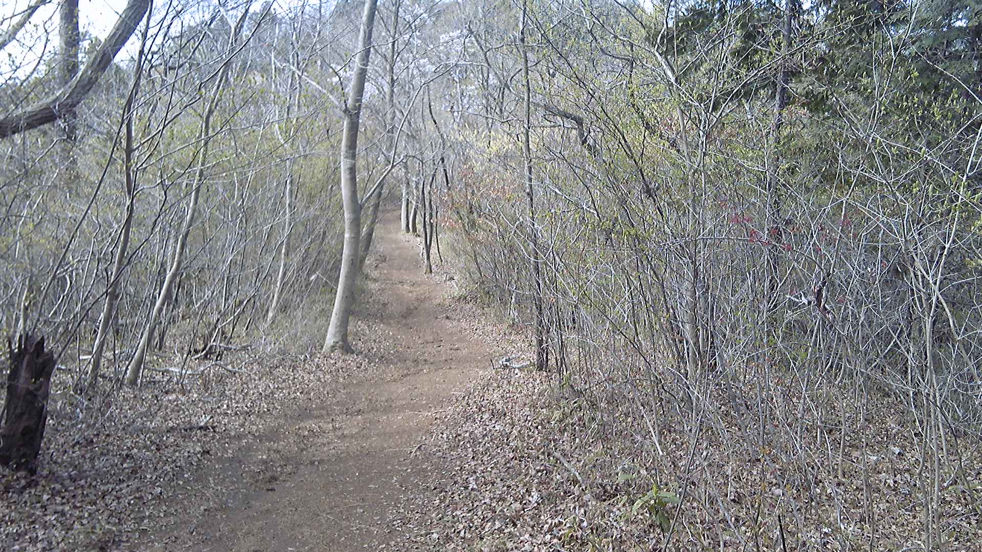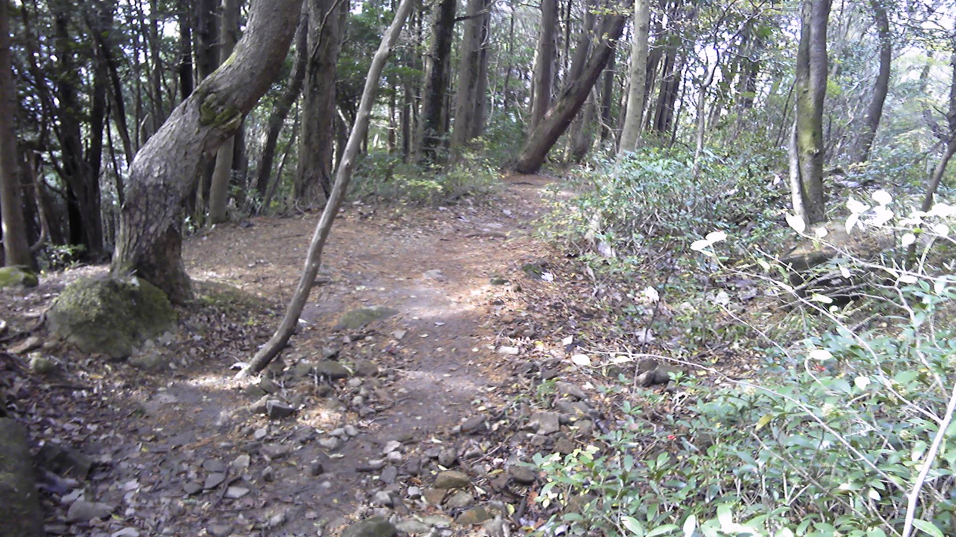 五輪塔から30分も下りた頃だろうか、行く手に太い道が現われた。これまでは踏み跡だが、今度ははっきりした登山道である。尾根から遠ざかる道だが、起伏もなく道幅も広い。ここを進めば登ってきた道に合流すると思われた。